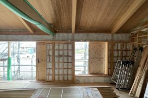 平屋だからこそできるナナメ天井&高天井がダイナミック。現場の段階ですがなかなかワクワクする空間でありまして、これは完成が今から待ち遠しくなります。