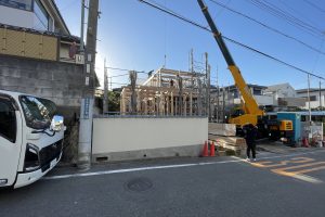棟上げから1週間ほど経った姿です。屋根のカタチも見えてきました。こちらはバルコニーがとっても面白いお家。物見櫓のような?これではなかなかイメージつきませんね。早く出来上がってご紹介したいですね。