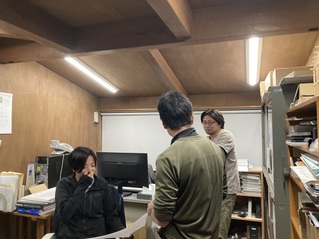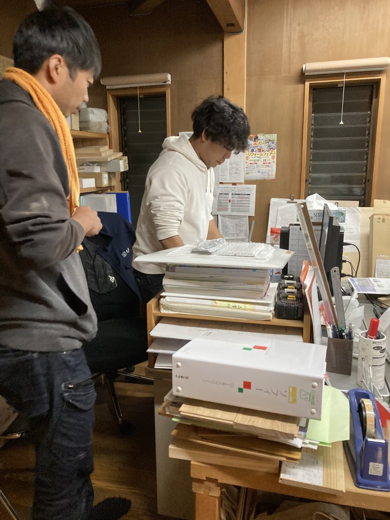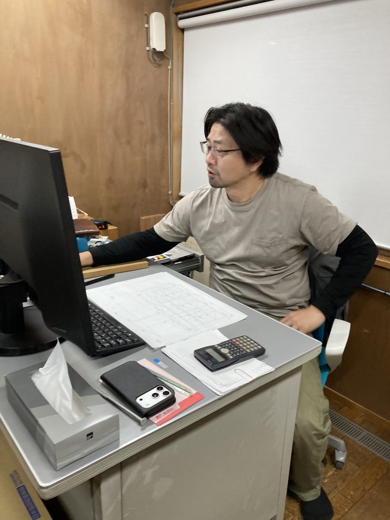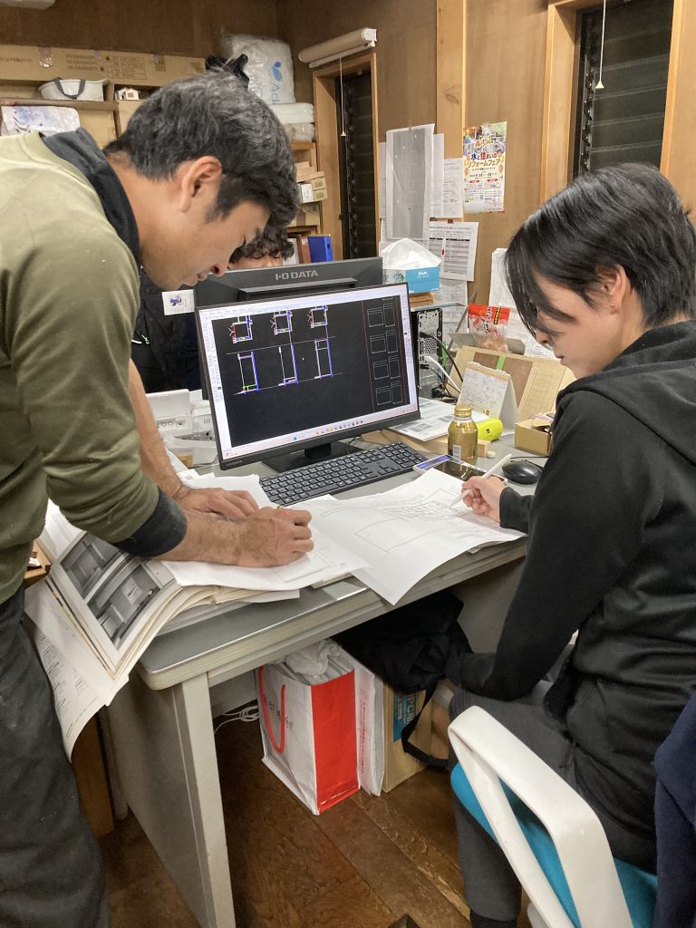 夕方は大工さんが現場から会社へ帰ってきて、設計担当と打合せや申し送りをする時間。