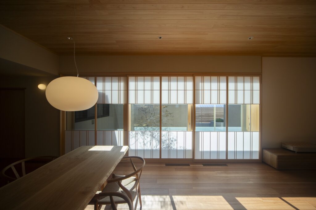 リビングダイニングの障子も繊細で綺麗なデザインで、かつ、このような面白い明け方もできます。普通皆様がよく見るのは「雪見障子=摺り上げ障子」といって、下半分が上にあがるタイプだと思いますから、このようなタイプはあまり見た事がないかもしれませんね。
