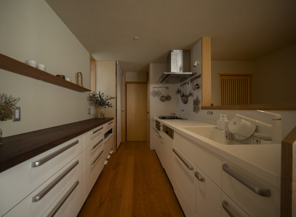は~い。皆様もお気になってると思いますので、キッチンも。白いキッチンに天板の黒っぽいウォールナットの無垢板が、とっても美しいです。