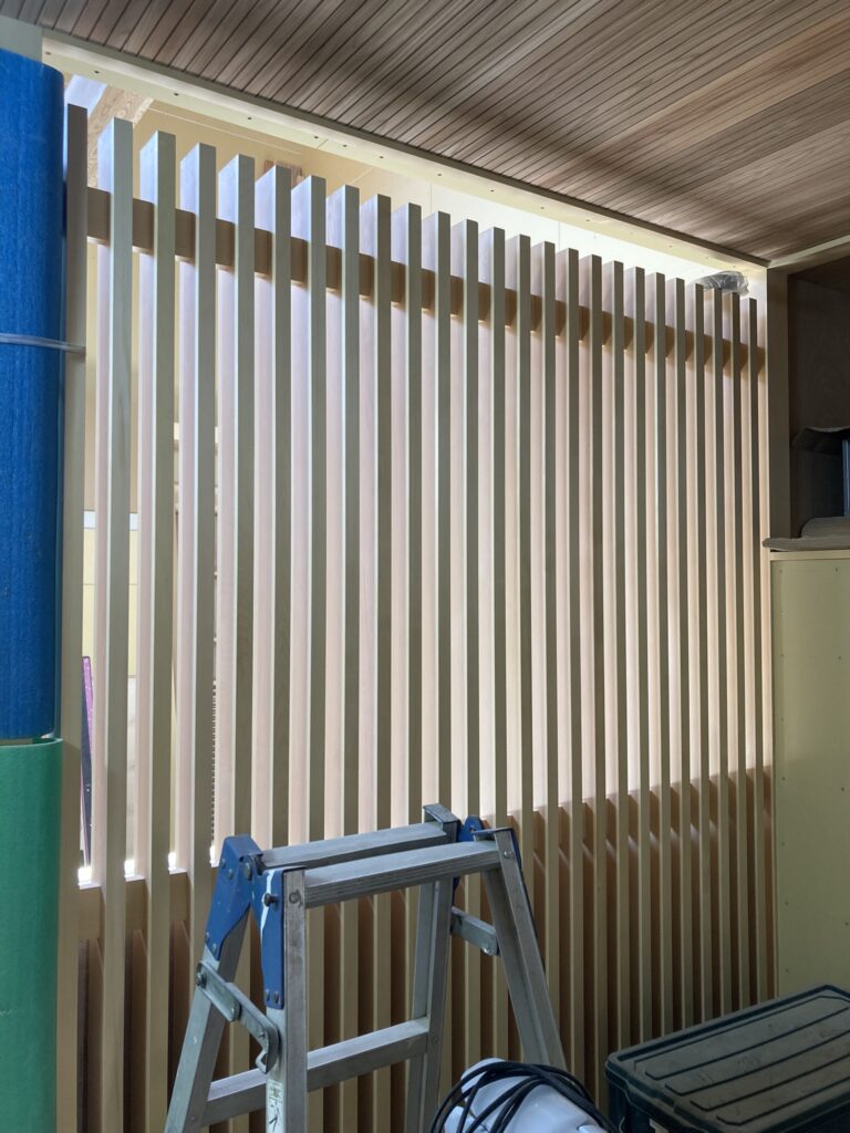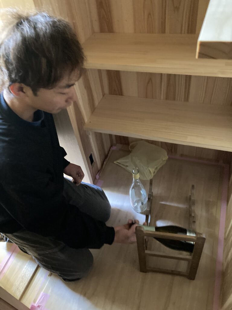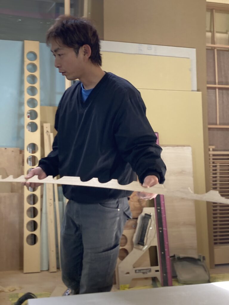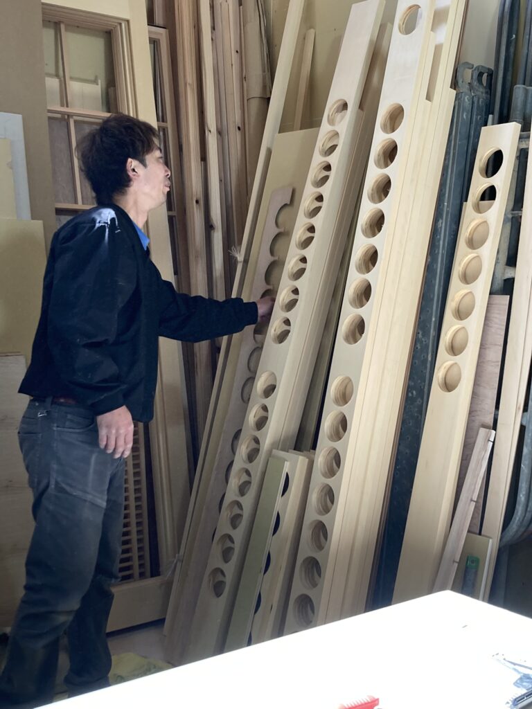 こちら、ワインセラーのあるお宅なので施主様の大事なワインのコレクションを並べる棚を拵えています。丸い穴が開いている材料、どんな棚になるんでしょうか?!楽しみです!!