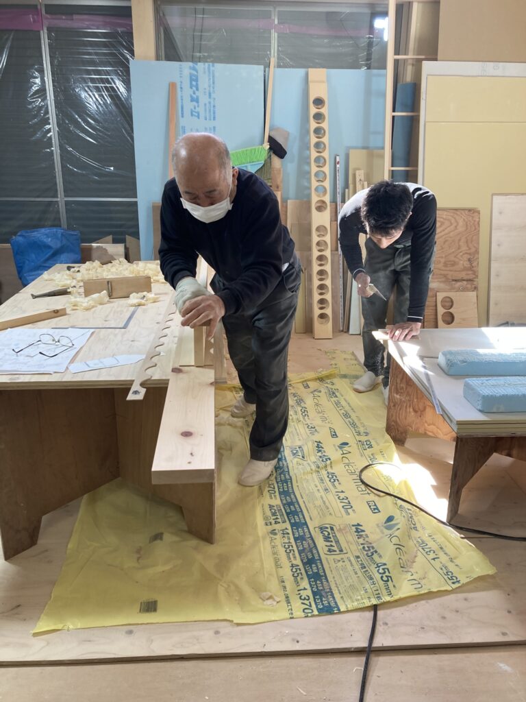 こちらを担当させていただいている大工さんは墨付けをした金子くん(勤続7年目)、坂本棟梁(勤続12年目)、ベテラン大工さん岡本さんのお三方。