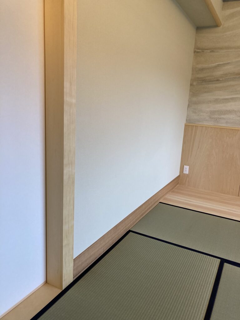 壁の隅に、普通は見切り材といって、端と端の接合部分を隠すような部材を取り付けるのですが、こちらはそれがないです。美しい仕上がりになっていました。