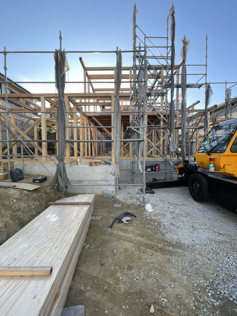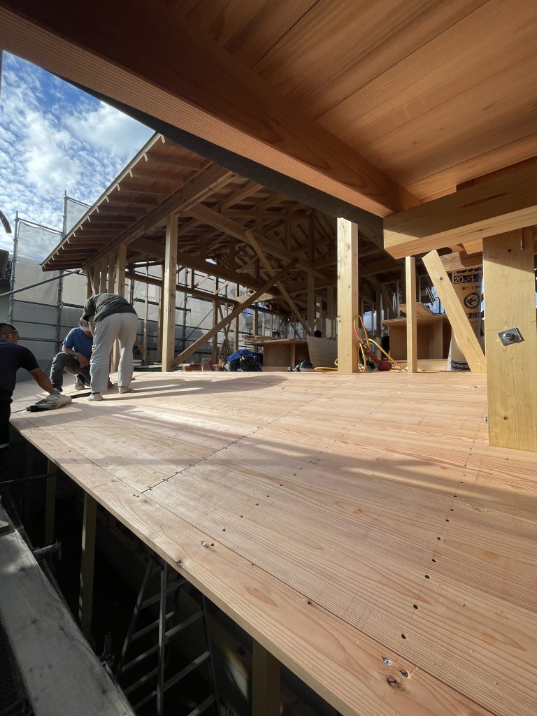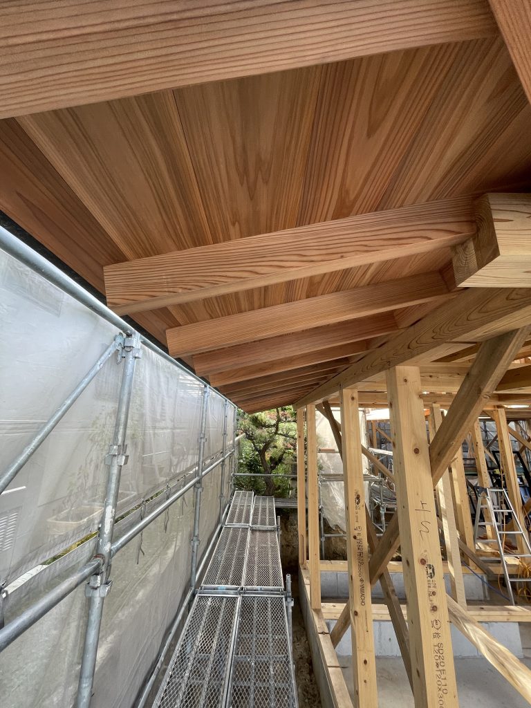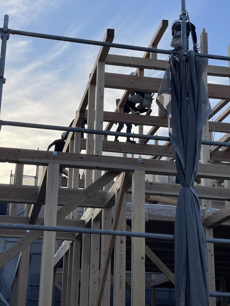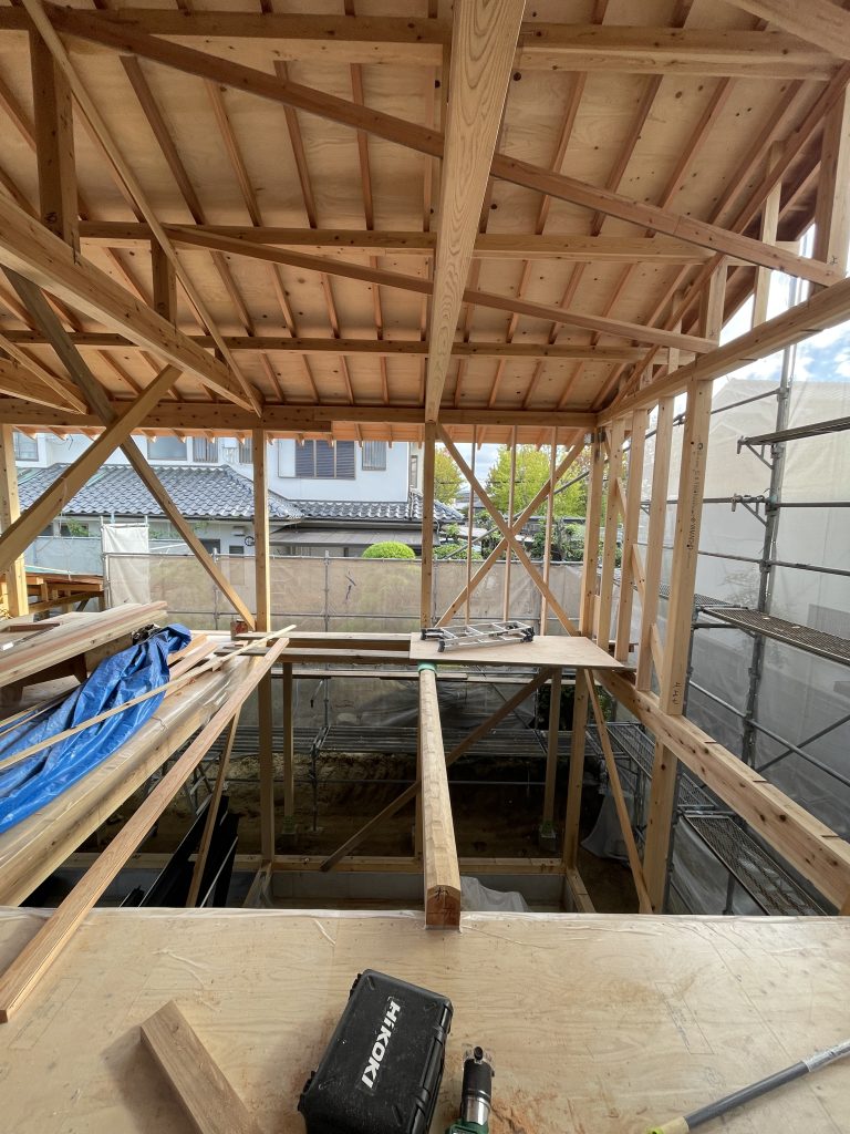 この頃になると、屋根下地が大きく張り出してきて、屋根の格好が見えてきて、上棟時よりも一段お家は大きくなった印象。