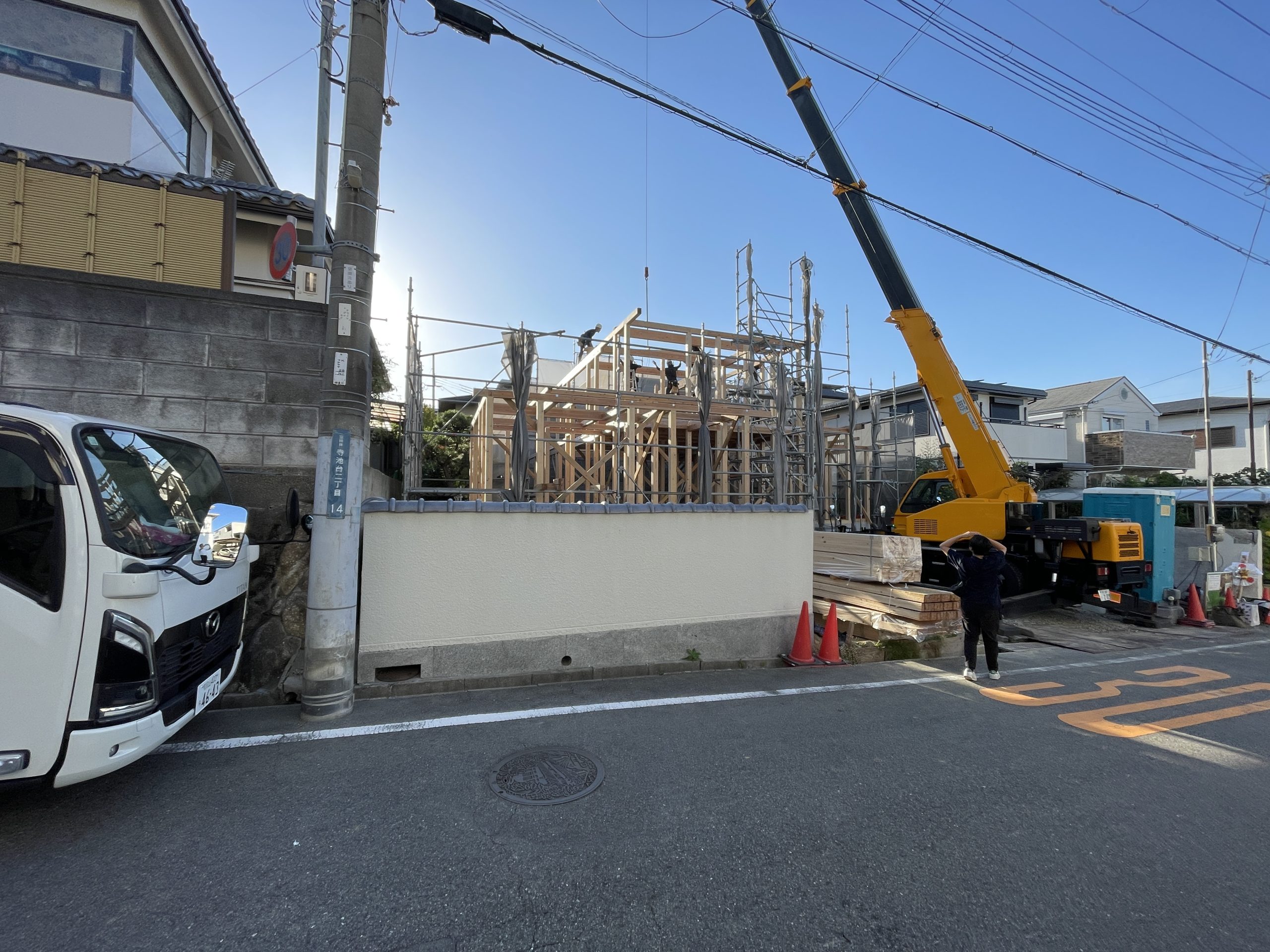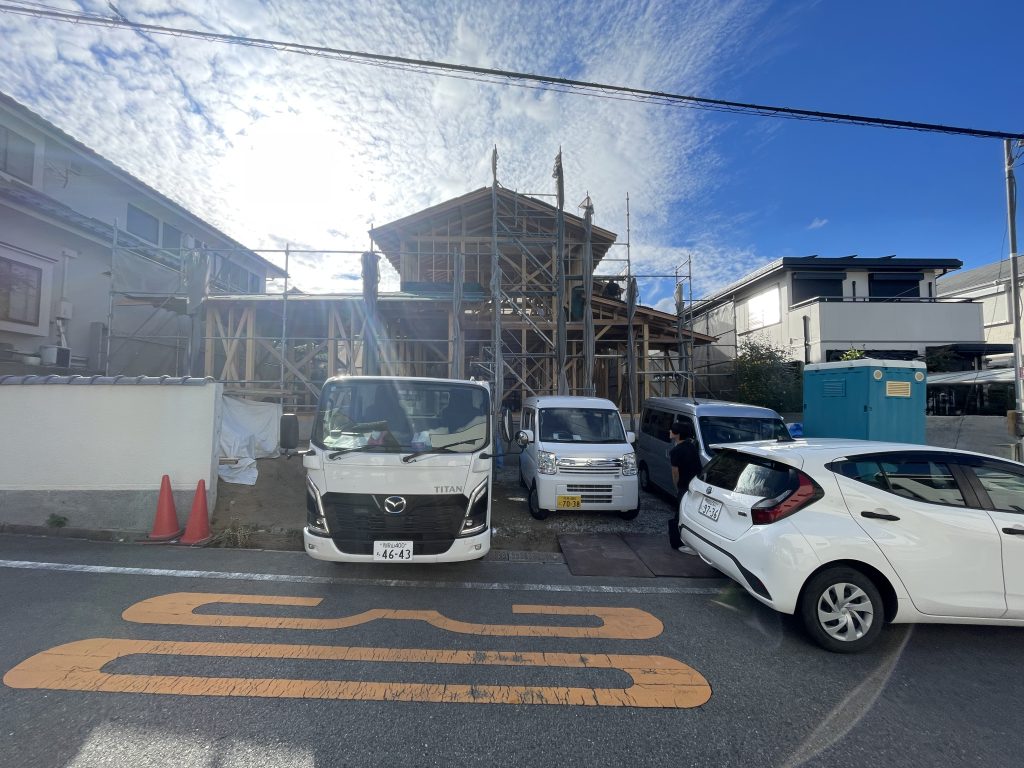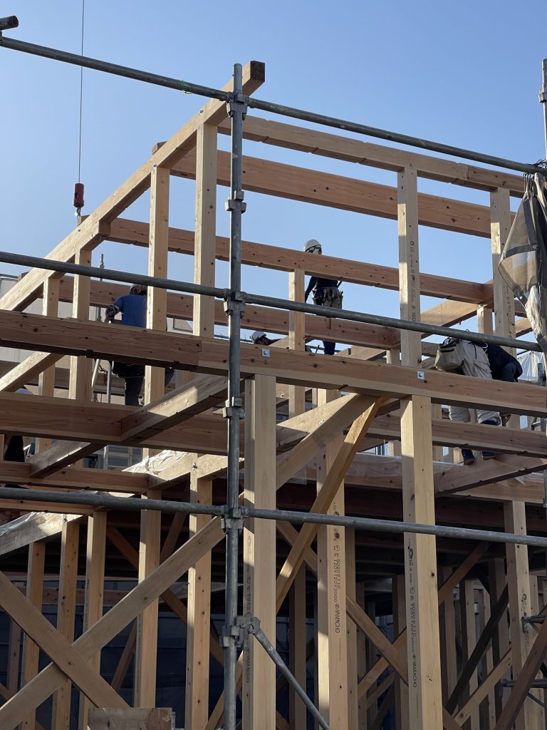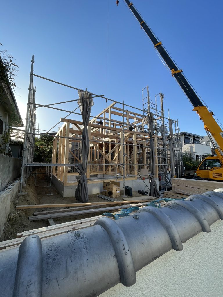 この頃になると、屋根下地が大きく張り出してきて、屋根の格好が見えてきて、上棟時よりも一段お家は大きくなった印象。