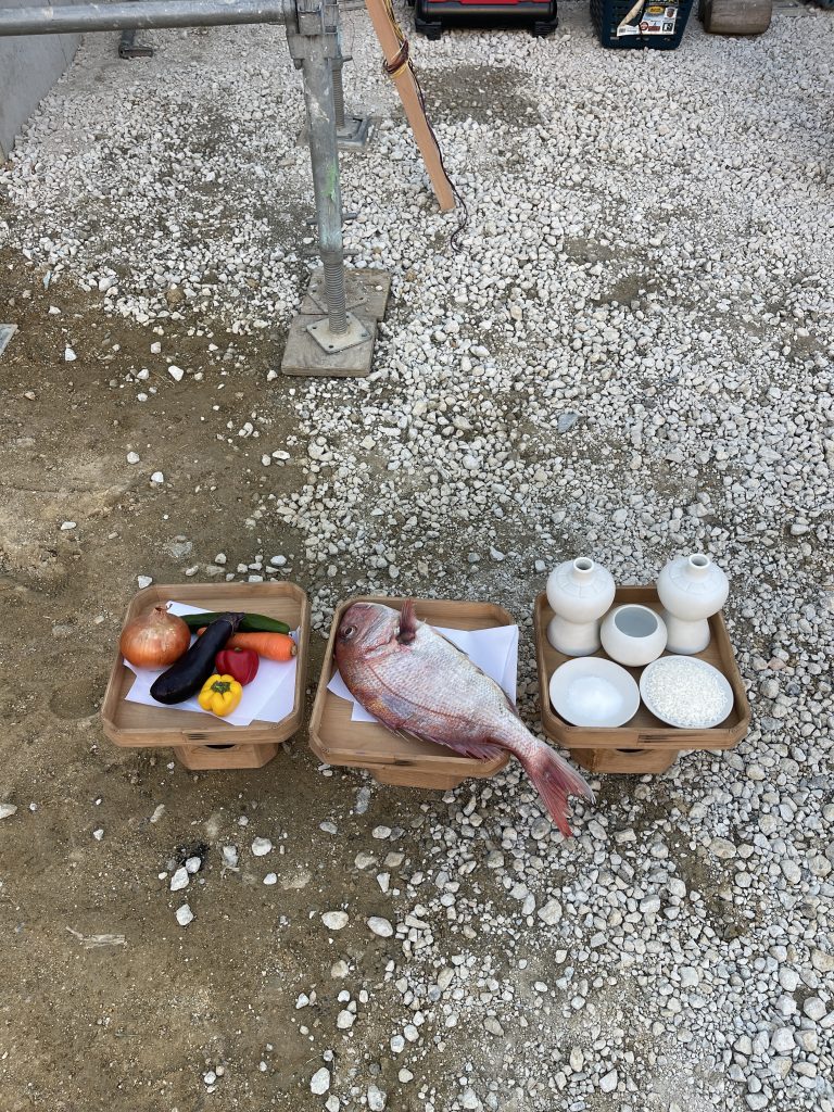 上棟作業が終わると、お客様にご用意いただいたお供えものをお家の最頂上部に飾り、無事棟が上がったお祝いと、お客様と一緒にこれからの工事の安全とお客様の弥栄を祈ります。