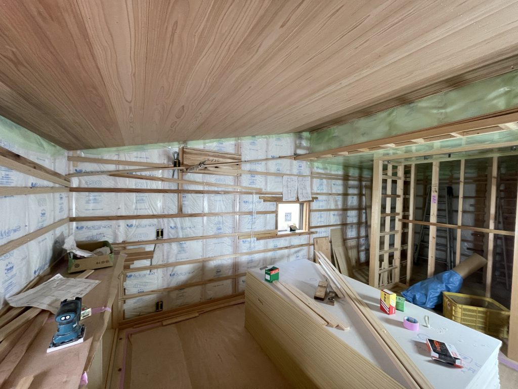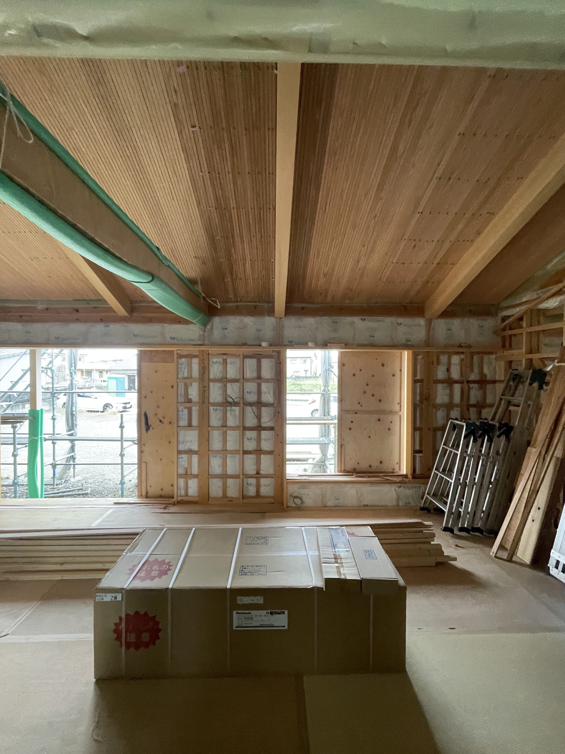 いきなり細部から入りますが、広間のベンチとテレビ台収納の一枚板(桜)も納まってきましたし、初めの写真のように天井板も各所に張られて、ここから壁のボードなどが張られると、お部屋の空間がぐっと姿を現わしだします。