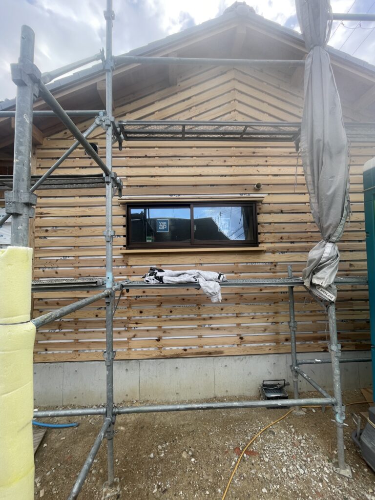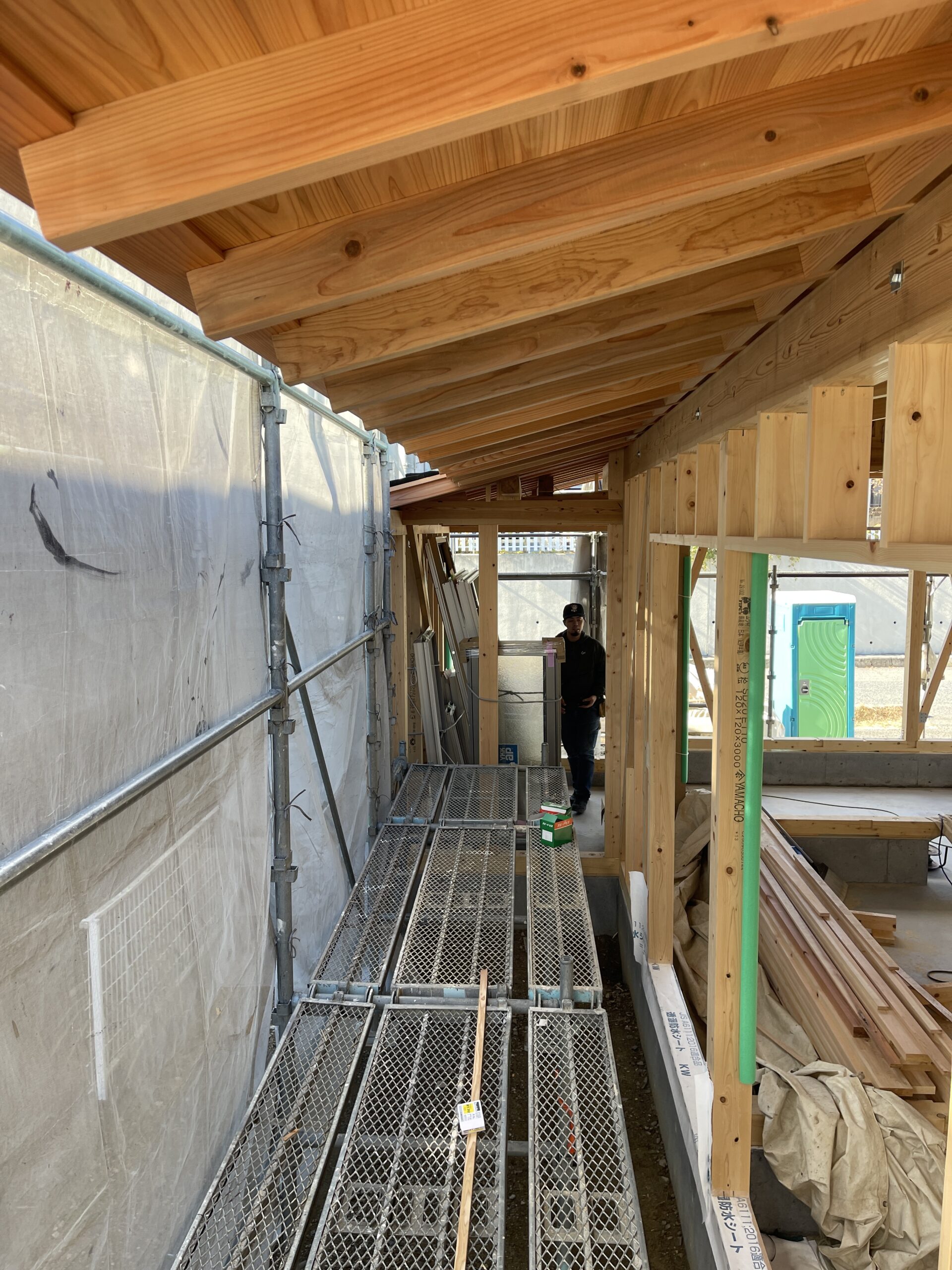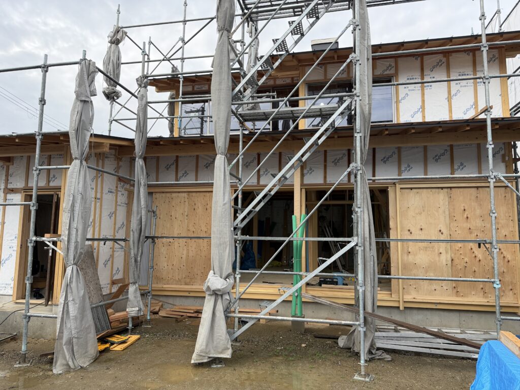こちらは前回の久保さんのBlogでご紹介させてもらいましたが、外回りの下地がほぼ終わったところ。2階の大きな窓が特徴のお家です。薪ストーブもあって、こちらも楽しみな所満載のお家です。