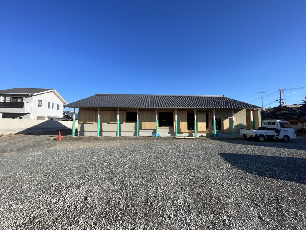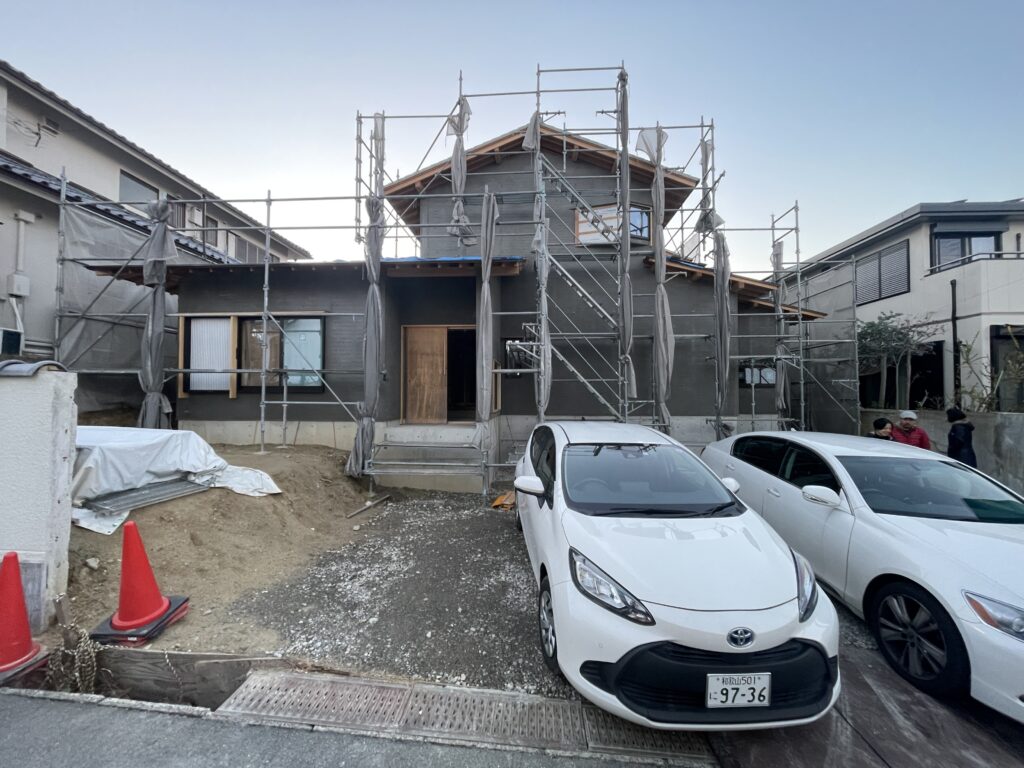 足場も外れ、外壁の左官塗も終わり、いよいよ全貌を現しだしたこちらのお家。すっと伸びた長い軒ラインが日本建築の美しさを現したような外観。