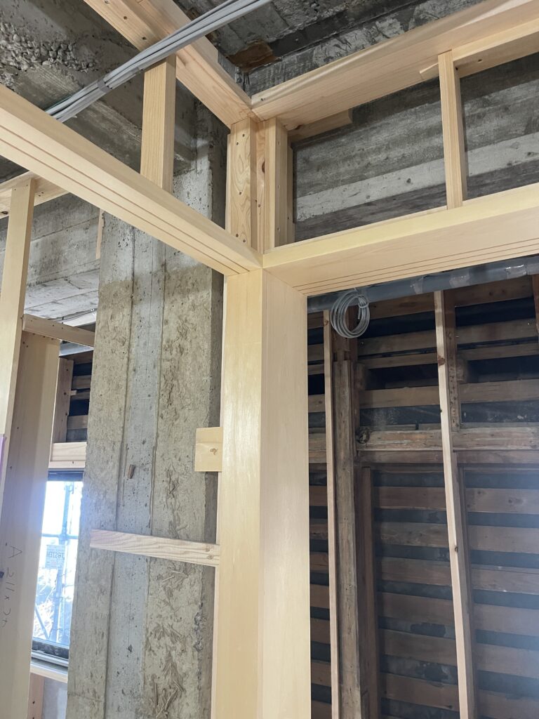 鉄筋コンクリートの構造体の中に木造の客室を造っていくイメージ。壁の下地、天井の下地が進みます。