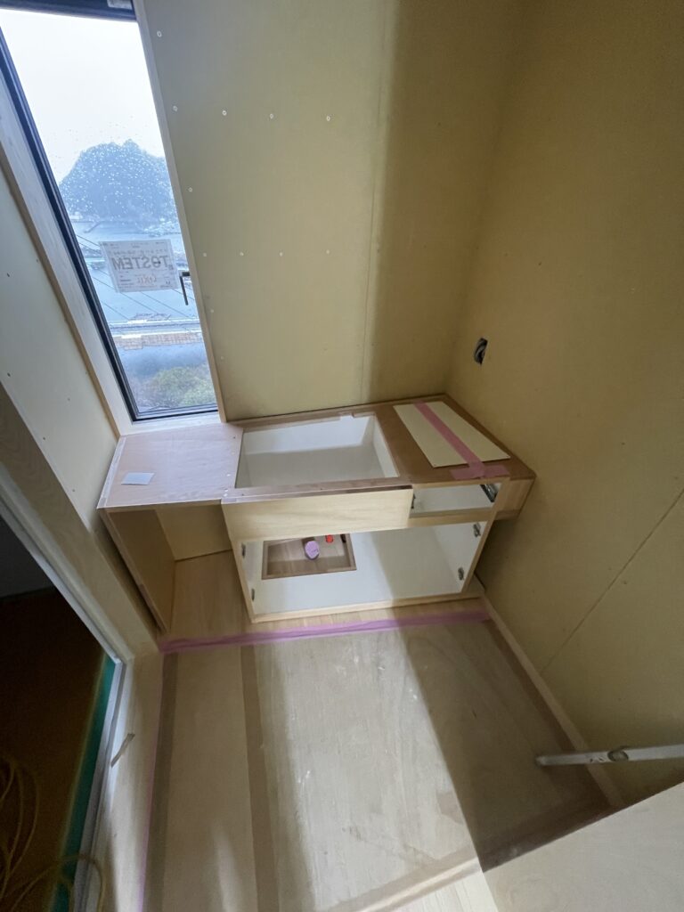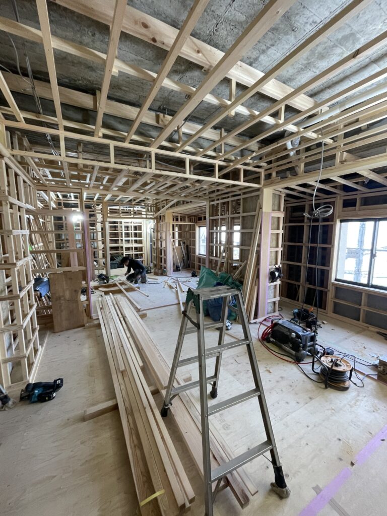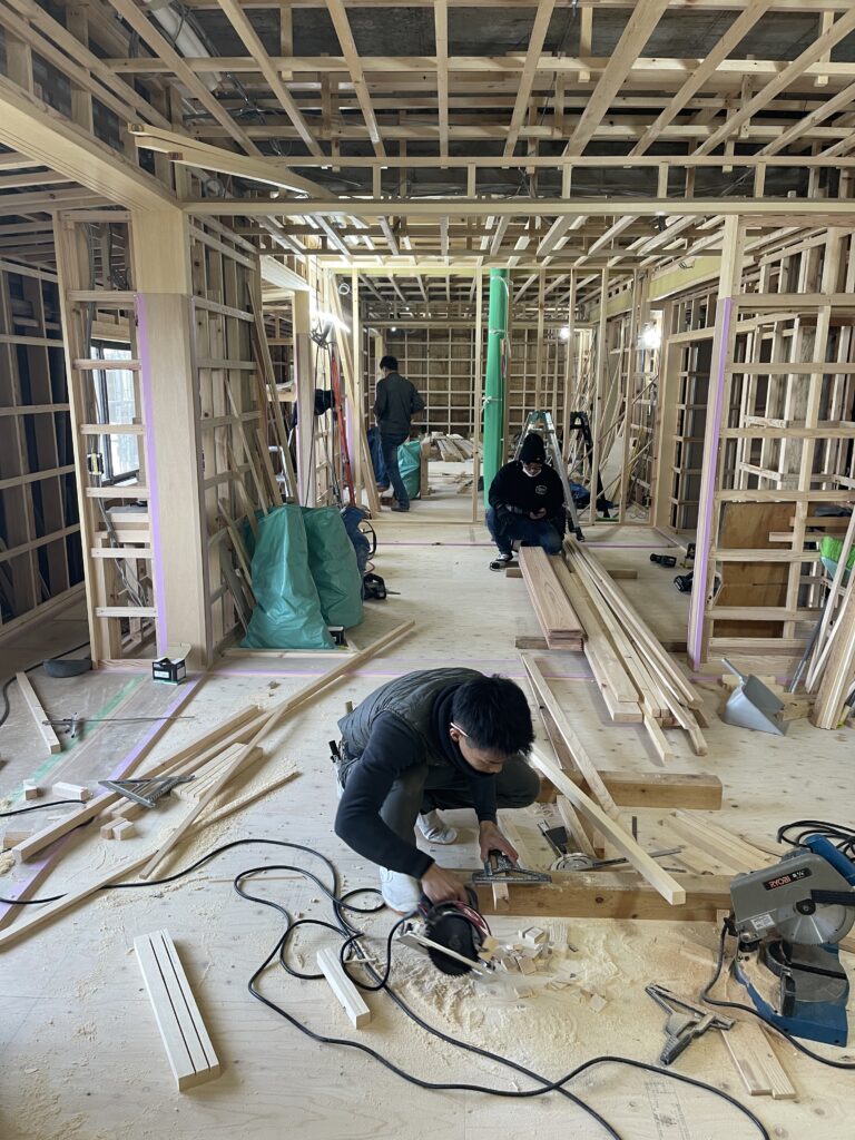 あとは、左官屋さんクロス屋さん、ペンキ屋さんなどの仕上げ工事の職人さんへバトンタッチ。その後、トイレや照明など設備屋さん電気屋さんの器具付けへと現場は進んでいきます。