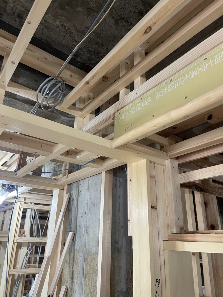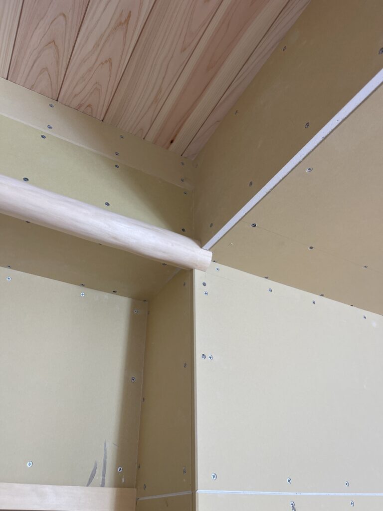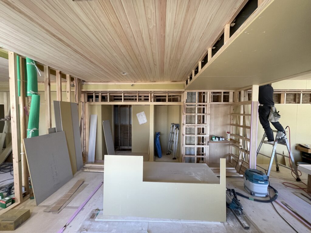 下地が終われば、ボードなどが張られていきます。天井の桧の板も美しく、