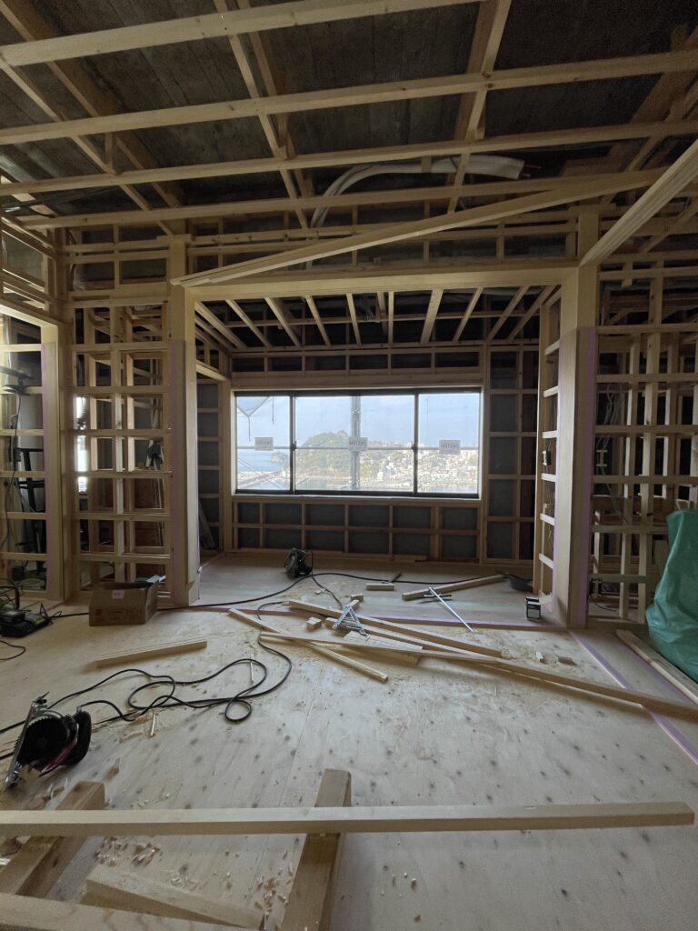 現場に来ると、眺めが素晴らしいな~といつもいつも癒されていた私と違い、大工さんたちも設計担当の幸前君もそんな事感じる余裕もありませんでした。