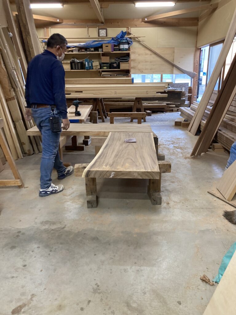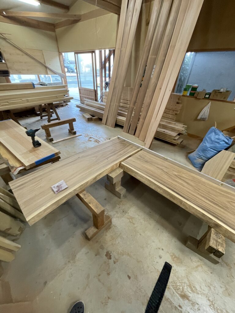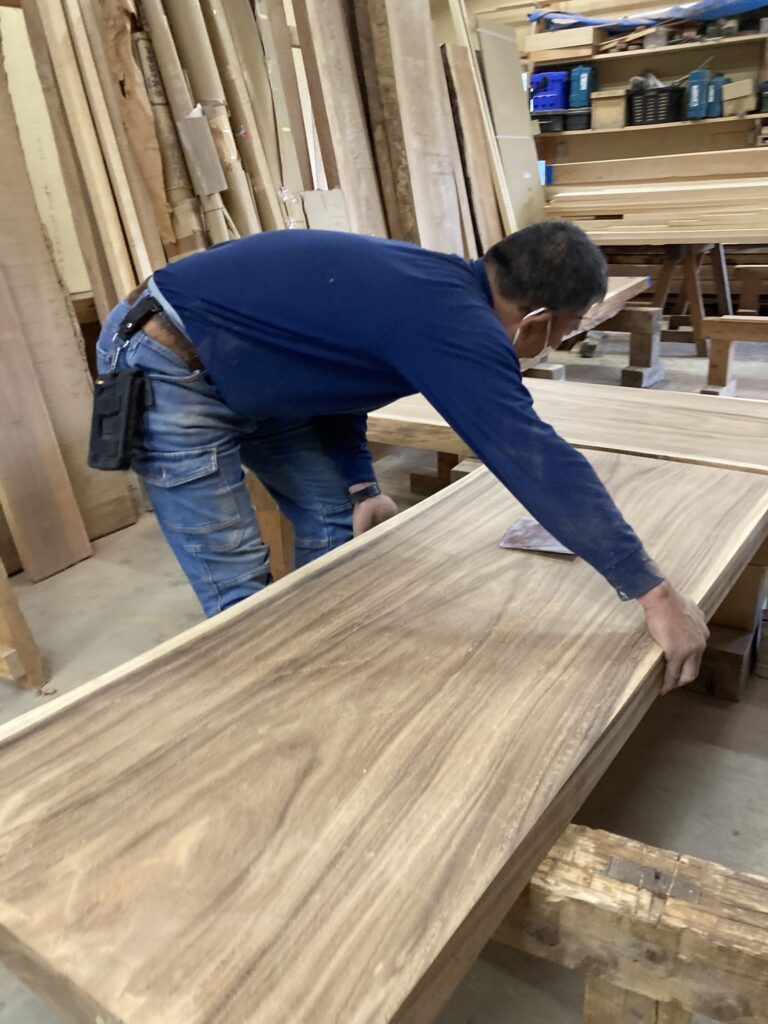 こちらの無垢一枚板カウンター、現場でL字に取り付けられるとの事。