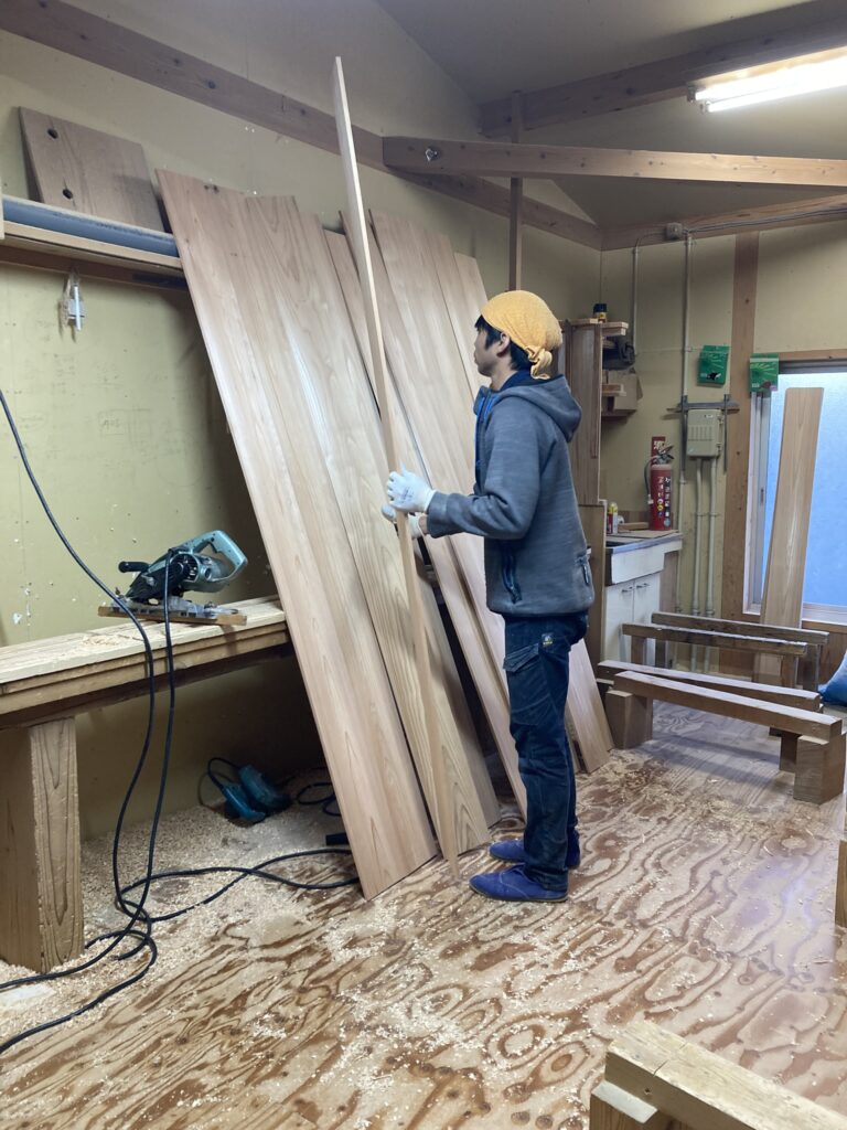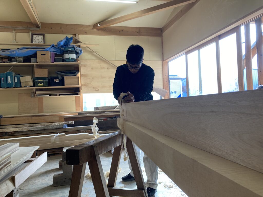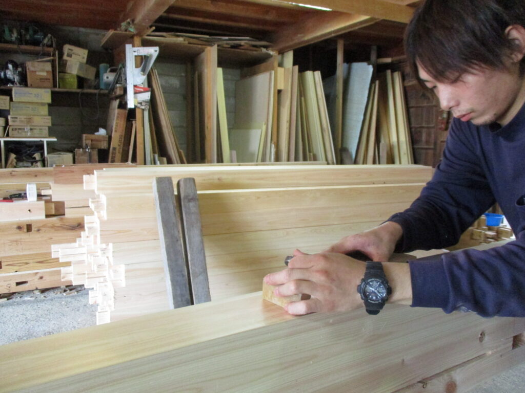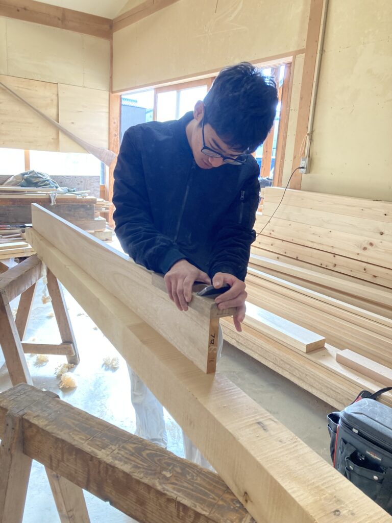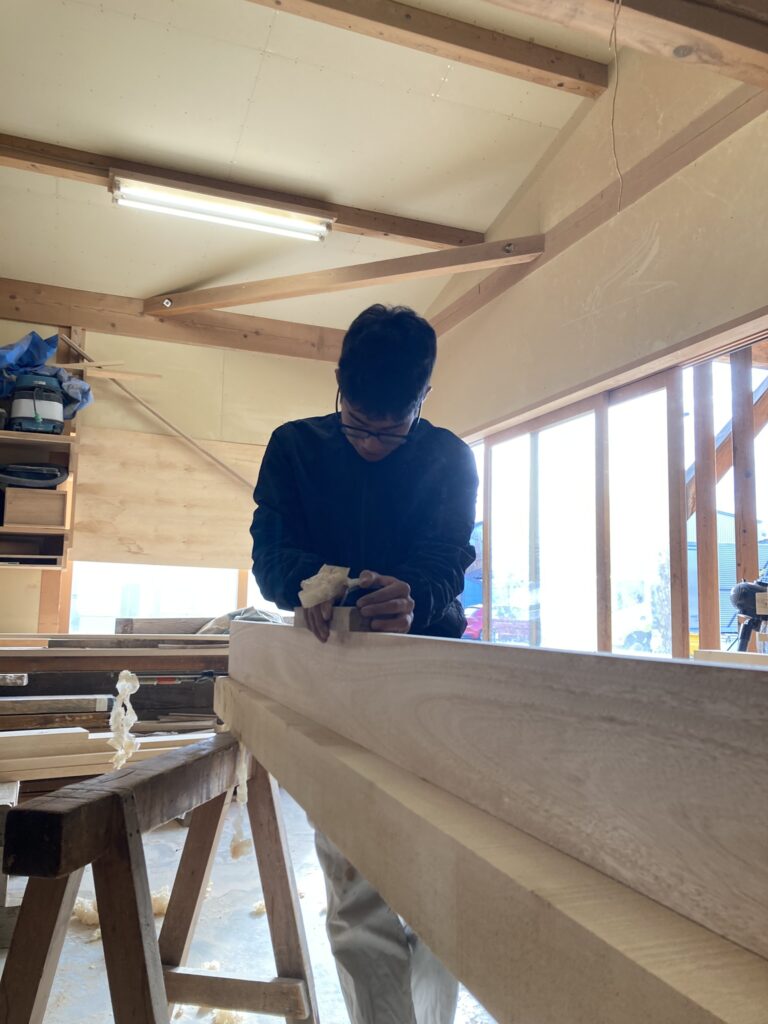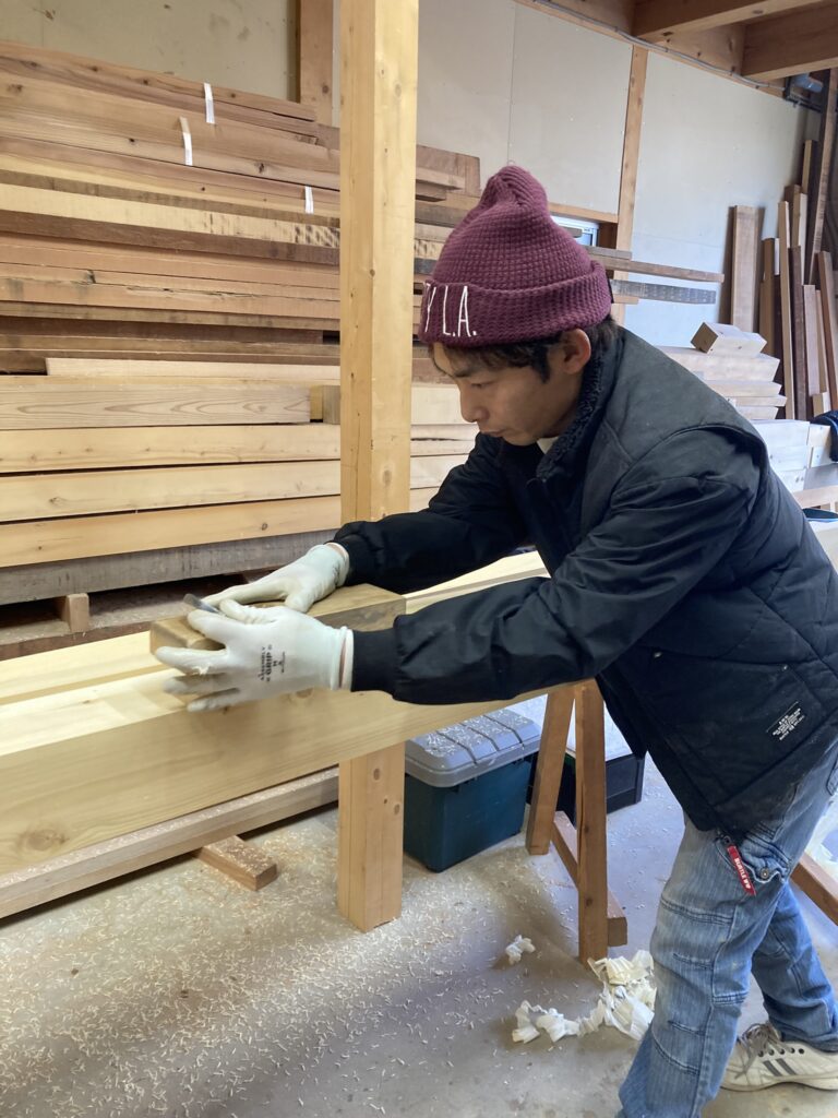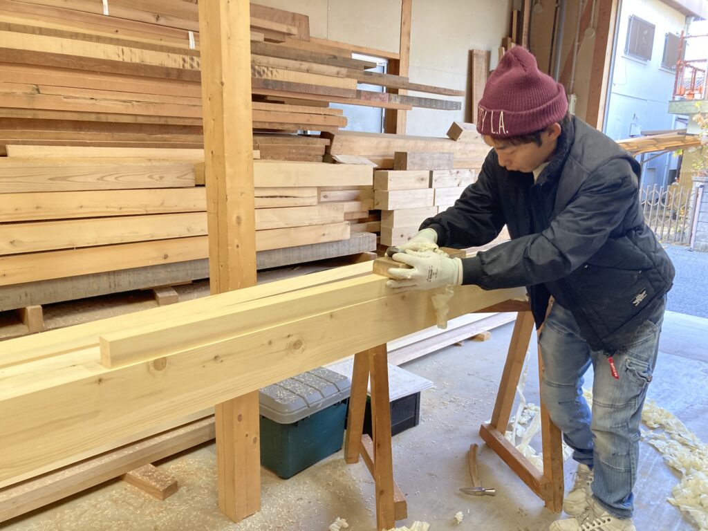 こちらは、もうすぐ入社1年の今城くん。額縁(戸の廻りの木枠)をカンナ掛けしています。