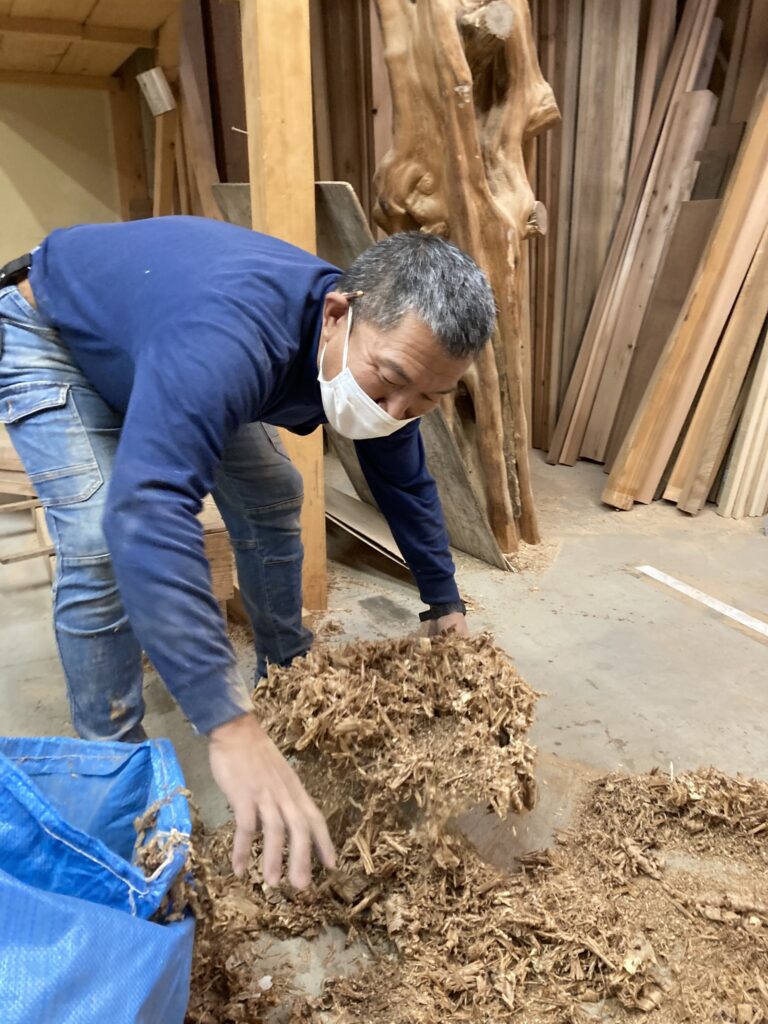 削り終わって掃除中の濵口さんです。
