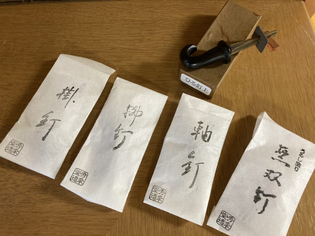 茶室の釘は、「どの流派で」「どの道具を」「どこに掛けるか」によって、種類、位置、向きが細かく決まっているそうです。裏千家と表千家でも向きが異なる場合があります。