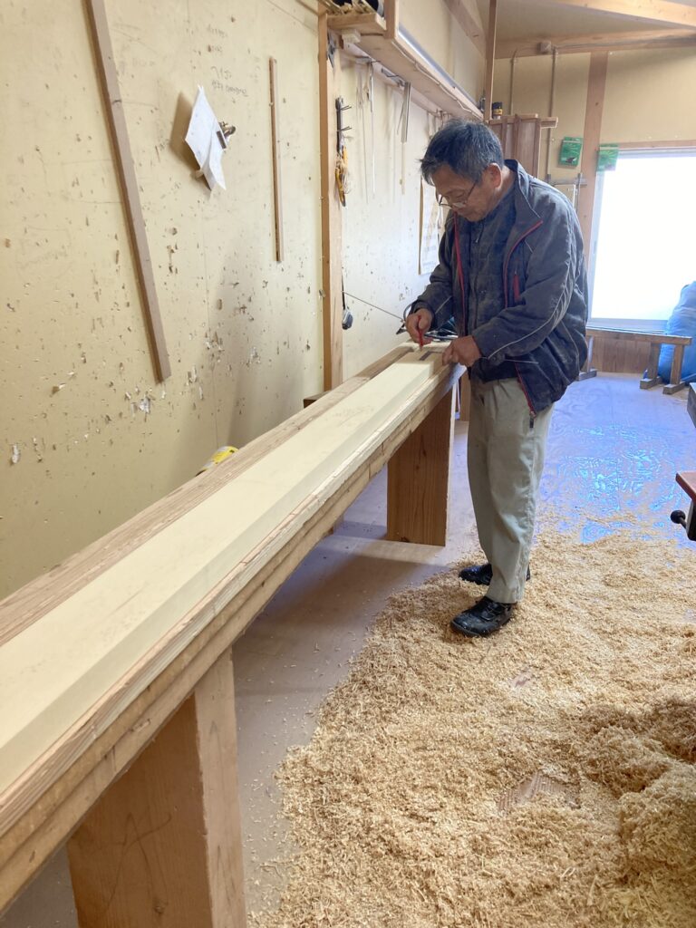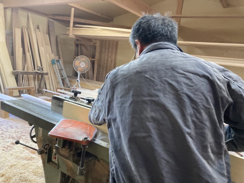 和室の材料をカンナ掛けしている所です。現場でできない仕事はその日だけ現場を抜けて、自社倉庫で材料の準備をします。