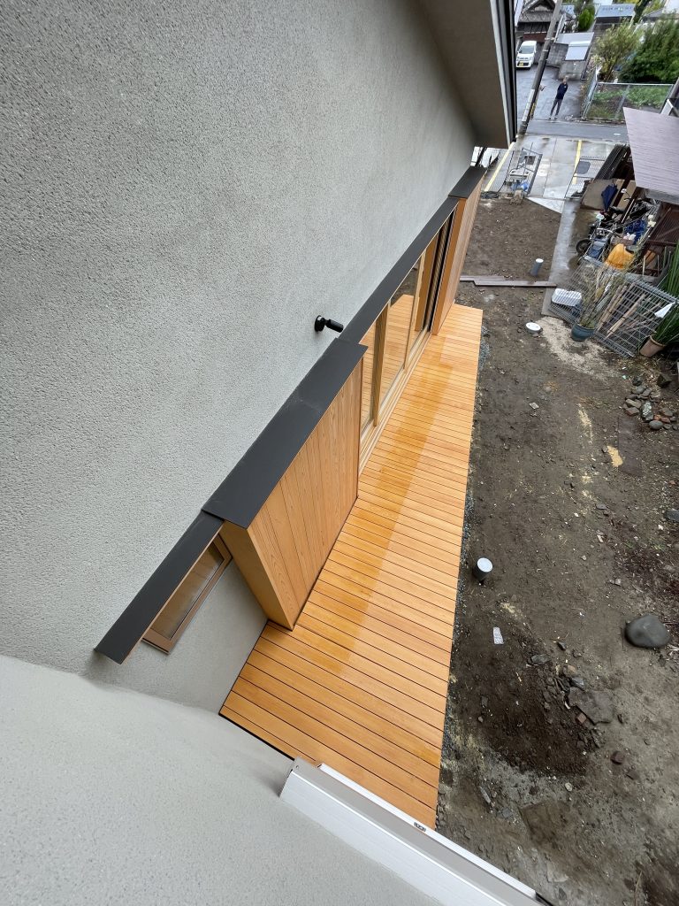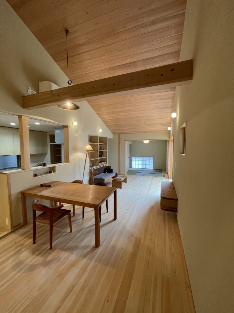 奥行きがもっとでて気持ち良いですね。左手の木の窓の外にデッキが広がり、お庭へとつながります。この辺はまた外構が出来てから。