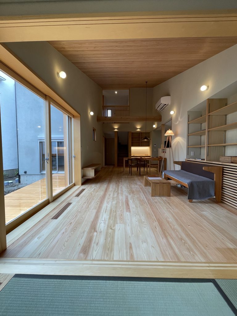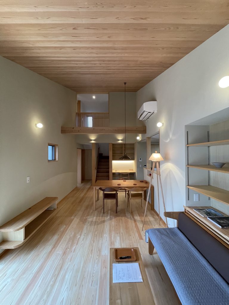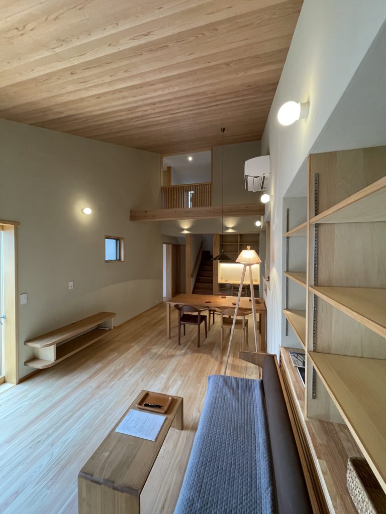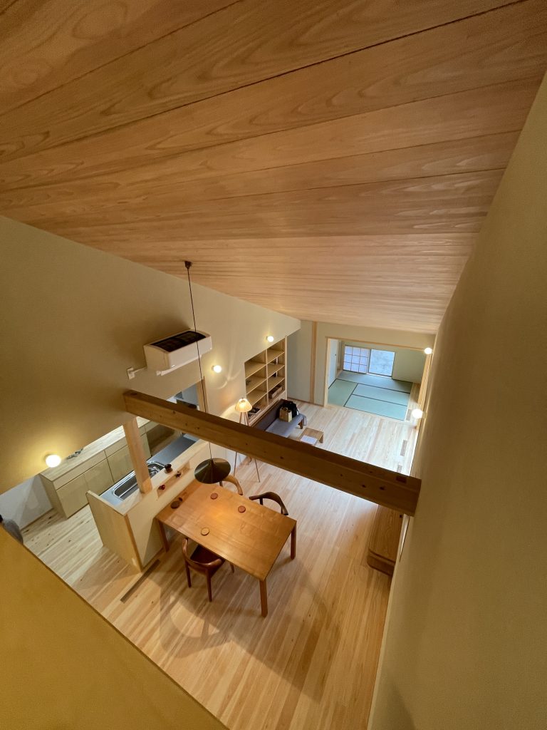 吹き抜けの大きな魅力=「見下ろし」のアングルはこちら。天井はいつもの吉野杉の赤身板。壁の白くて柔らかいライティングが左官壁の雰囲気を優しく照らして、より「やわらかな」印象にしてくれています。