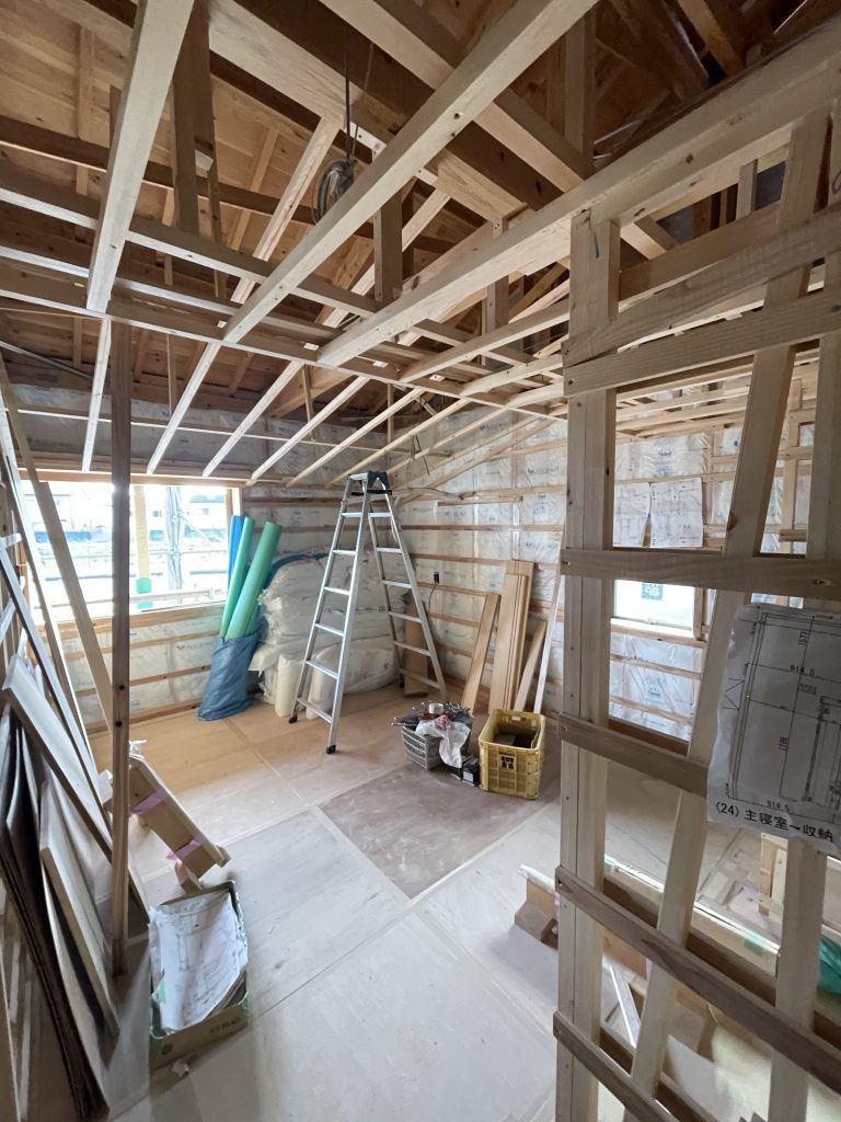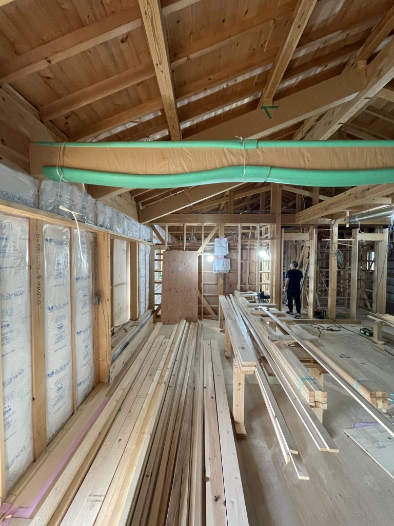 壁下地に加えて、天井の下地も格好がついてきて、内部空間も随分と雰囲気がわかるようになってきました。ここから、どんどんお家は色々な所が出来てきて、ぐんぐん楽しくなってまいります。