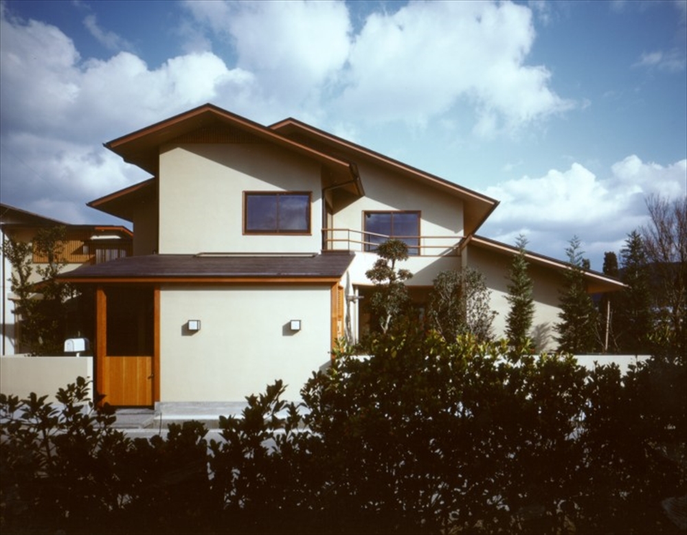 連切妻の家【和歌山市】2000年以前 ▲夜の外観。風情があって美しいですね ▲吹き抜けから奥の和室を見る。対角線に伸びる視線は広く感じさせます ▲リビング吹き抜け南。障子を通して柔らかい光が入ってきます ▲和室床の間 ▲2階ホール。吹き抜けに面して明るく ▲玄関ホールより和室を見る。手前の飾り棚が綺麗 ▲玄関。那智黒石をちらした土間デザインが面白い