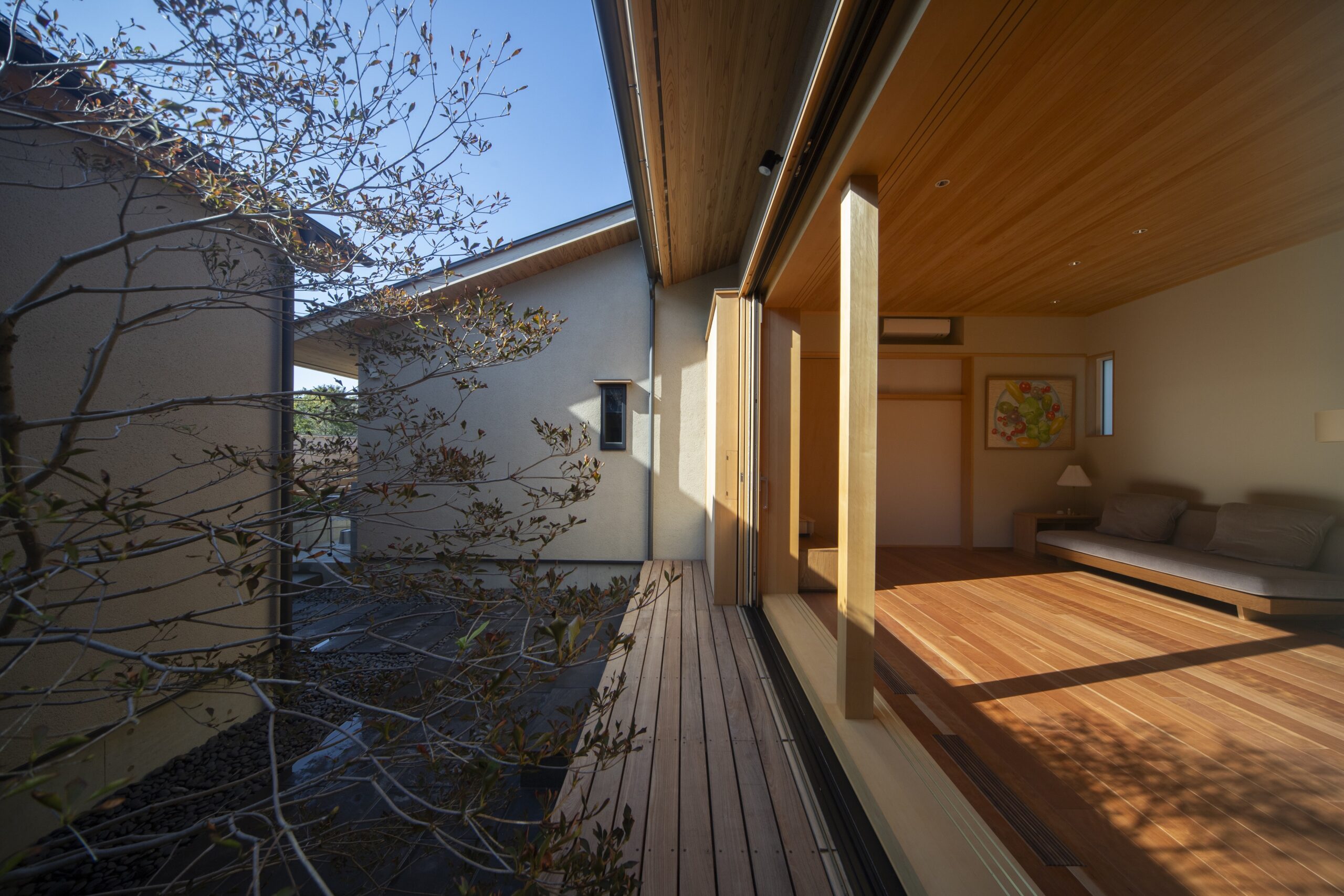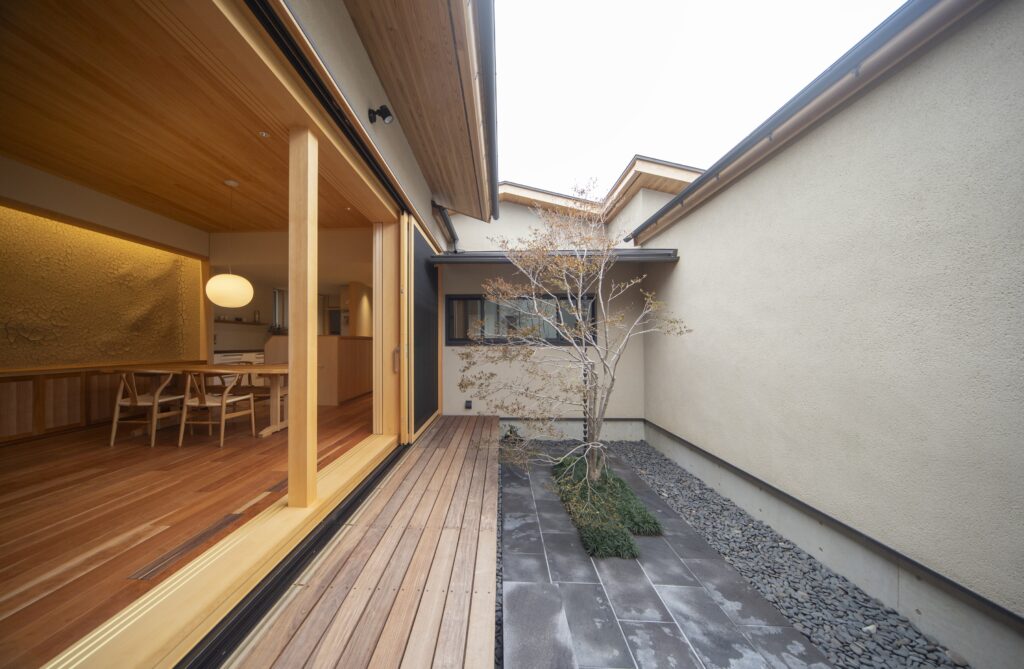 南隣地一杯にお家が建ったこと、そもそもの強いご要望として「周囲の視線を気にせずゆっくり過ごしたい!」があったことから、建物でお庭を囲む=コートハウス型のプランとし、そこを核にお家の空間は造られていきました。そのリビングの中心には幅6m×高さ2.4mの大きな木製サッシュがあって(いつも以上に大きいため動作性能と気密断熱性能から木製サッシュを採用)、全て開ききると中庭も室内と一体になり素晴らしい開放感が得られます。