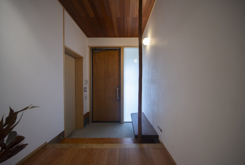 玄関ドアは断熱気密へのこだわりと多機能性も求め既製品のサッシュを選びましたが、横に木枠FIXをつなげ全体的にも無垢の木枠でカバーすることによってサッシュ感を減じるようにしました。天井のマホガニー、床のブラックチェリーに加え、式台やベンチ、上り框、手すりに使った様々な銘木(椿、キワダ、ウォールナットなど)が、まず出迎えてくれることによって、その後に続くこのお家の美しさ上質さへの導入となっています。多種多様な木が玄関という大きくない空間にあるわけで、普通考えるとお互いが喧嘩しそうにも思いますが、上質な天然木材どうしはお互いをより引き立ててくれます。これはシート貼りの人工物やペンキなどでは決してうまくいかず、不思議な物です。