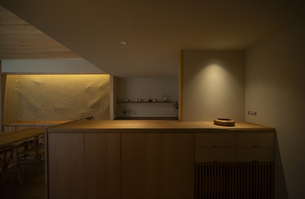 リビング北側には大きな飾り棚カウンター。その背面壁には存在感抜群の「土割れ壁」。左官職人の名人として世界的に有名な久住有生さんの仕事を参考にお客様と左官屋さんと一緒に考えました。
