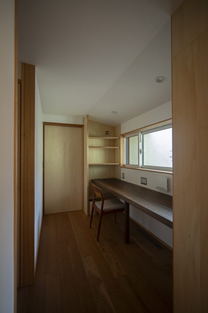 そのホールをリビングへ進まず、左へ折れると、お仕事をお家でされるための書斎空間です。中庭に面し、外を感じながらも隣地や歩く方や車からの視線は感じず、気持ちよく安心して没頭いただける空間にいたしました。