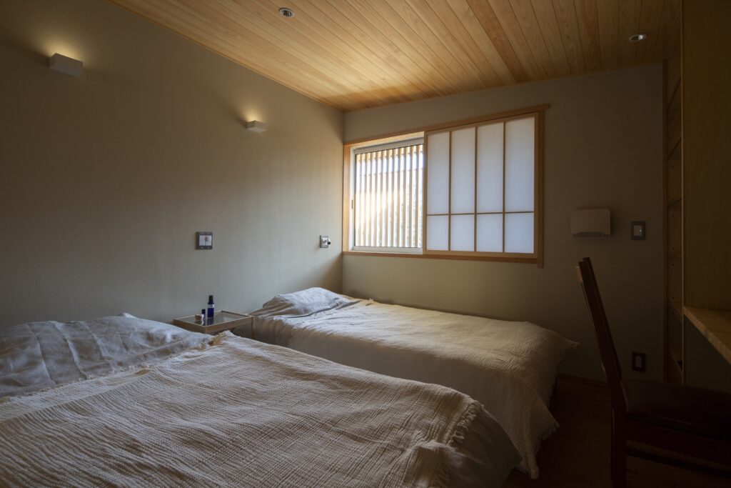 その書斎空間から続くのが、寝室。朝日を感じて目を覚ましたいとのご要望から東側へ配置。道路に面しますので木格子を設けその前に落葉樹を。柔らかく視線をカットして光を取り込むようにしています。また、天井を勾配にし足元へ下げて落ち着いた寝室になるように考えています。