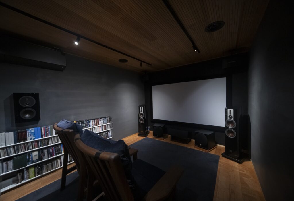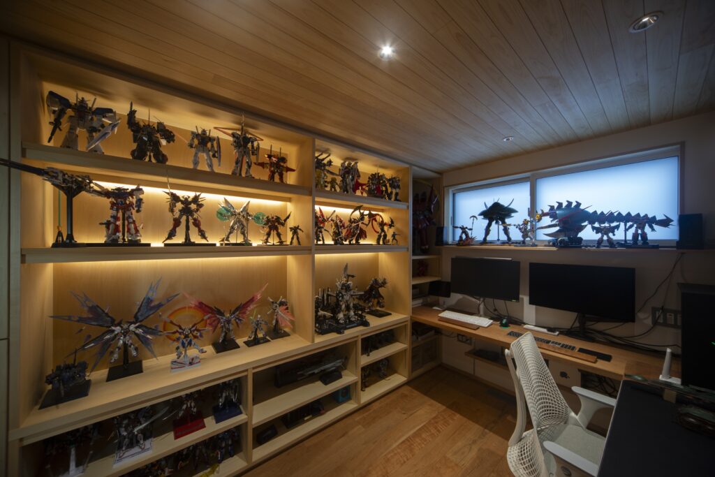 また、先ほどの書斎の奥へとつながるのが趣味の部屋。ご主人のプラモデルがずらっと並ぶ空間と、映画や音楽を楽しめる防音室。プロにご協力いただき本格的な防音室となりました。お家での暮らしを存分に楽しんでいただけるように。羨ましいお部屋ですね。