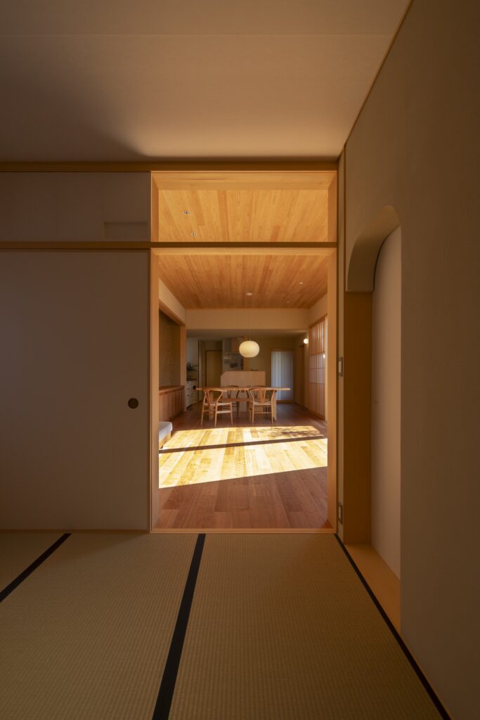 リビングの奥には和室。リビングの続きとして寝転がってリラックスもできるように、肩肘張らない和室です。フスマ紙や引手など細部もこちらのお家のリビング空間の雰囲気と自然とつながるように気を付けました。
