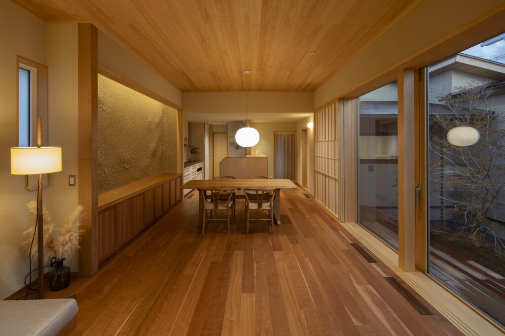 リビングの開口部の高さを2.4mにあげたこともあって、いつもよりもあげて天井高さは2.8mに。ゆったりとしたリビングダイニングの広さと天井高さが上手く合って、大味にならず、落ち着いた上質で美しいリビングダイニング空間が生まれました。また、お客様のこだわりでテレビを配置せず、漆喰壁にプロジェクターで投影するようにしたこともこの空間に非常にマッチしたと思います。